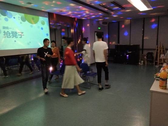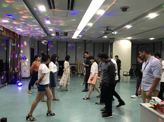 热身结束,就正式进入主题了。舞协老师带领大家学习了交谊舞——慢三和恰恰的基本舞步。在时明时暗的灯光下,同学们跃跃欲试,开始了放松的交流和互动,现场气氛达到了一个小高潮。