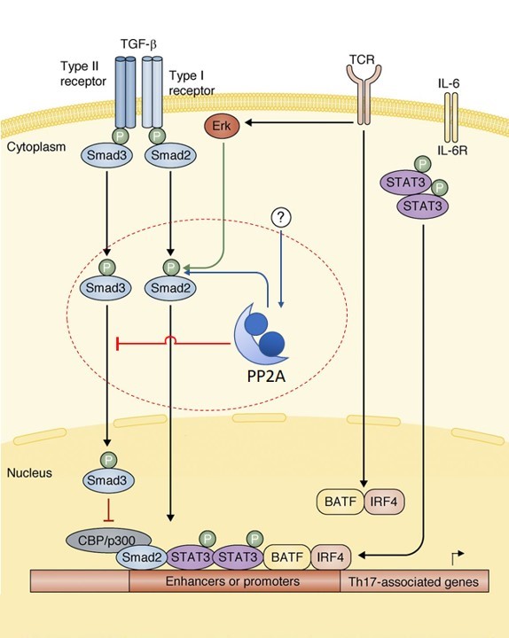 Figure 1:PP2A promotes TH17 cell differentiationthrough differential regulation of SMAD2 and SMAD3 Phosphorylation ( Adaptedfrom Gustavo J. Martinez, JEM 2017).