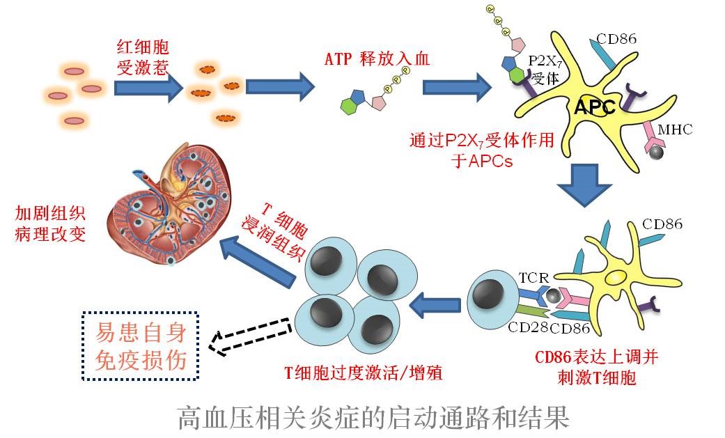 该研究发现在高血压小鼠模型里,抗原特异性T细胞免疫应答增强,这一增强还表现在T细胞介导的自身免疫性糖尿病和自身免疫肝病在高血压个体里加重。对免疫系统分析表明高血压个体T细胞自身活性亢进有限,而最显著的改变是抗原提呈细胞上调了共刺激因子CD86的表达。CD86过表达是高血压下T细胞反应亢进的原因。免疫系统的激活通常由两大类分子启动。一类是病原体相关模式分子(PAMPs),另一类是危险/损伤相关模式分子(DAMPs)。与PAMPs来自于病原体不同,DAMPs是哺乳动物自身具有的分子,在正常状态下它们在细胞外的浓度很低。当组织细胞受到损伤、缺氧等刺激后,这些分子会释放出来造成局部组织高浓度,由此吸引免疫细胞并激活免疫系统参与修复。考虑到高血压是一种非感染性系统性炎症,研究人员检测了血浆里一系列DAMPs分子的浓度,发现高血压早期血液里的红细胞(可能因血流动力学改变的激惹)释放三磷酸腺苷(ATP),导致血浆中ATP显著增高。系统性的细胞外液ATP浓度升高作为“危险信号”动员免疫细胞,尤其是通过P2X7受体诱导抗原提呈细胞上调CD86的表达。水解细胞外ATP或者阻断P2X7受体均可有效阻断高血压下CD86的上调并纠正T细胞的高反应性。最后,研究人员分析了包括正常血压和高血压人群的血浆样本,发现ATP浓度与血压呈正相关性。这一系列结果强烈提示ATP-P2X7-CD86通路的打开是高血压下早期致炎的核心事件。