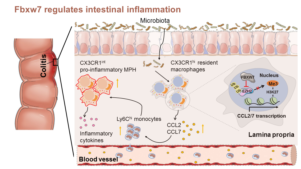 因此,该研究揭示了肠道炎性微环境巨噬细胞中Fbxw7/EZH2/CCL2/7途径正向调控炎症的发生发展,并提示Fbxw7可能作为炎症性肠病的诊断标志物和潜在治疗靶点。