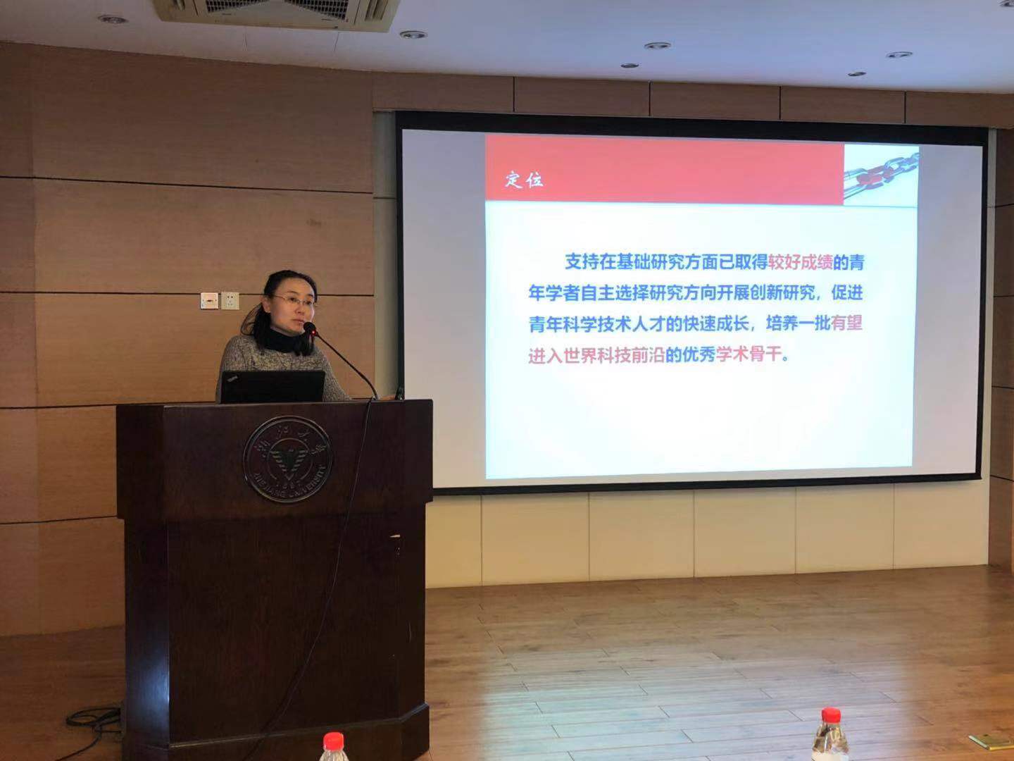 医学院科研项目与成果办负责国家自然基金项目管理的郑轶副主任结合2020年申报形势,从优青项目申报的基本情况、申报注意事项、形式审查的注意要点三方面对申报政策和流程做了系统解读。郑老师指出,优青项目申报除了要做好前期准备、申请书撰写和答辩准备等工作以外,还要重点关注学术诚信,在申报的任何环节都要时刻注意客观公正、认真仔细,莫要因小失大。